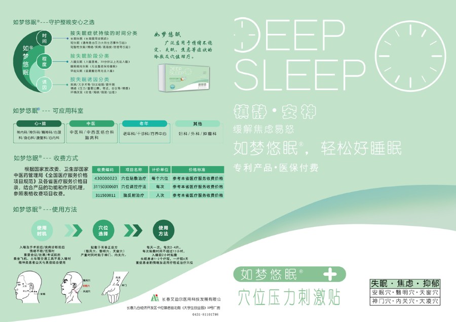 產品優勢:用于各類失眠,長期失眠或因壓力、情緒、環境改變等引起的短期失眠。睡覺前一小時貼于手腕處(神門穴、內關穴)或耳后(翳風穴、安眠穴、風池穴),無藥物成分,不刺激肝腎,透皮效果好,攜帶方便,使用方便。